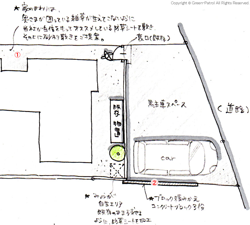 こちらはご提案平面プランの右半分です。①家の周りは雑草が生えてこないように、当社が自信をもってオススメしている防草シートを敷き、その上に砂利を敷きます。防草シートの品質はピンからキリまであって、ご自分で選んで失敗してしまうと、雑草がまた生えてきて、やり直しの工事が必要となる場合がありますので、ここはプロにお任せいただきたいです。